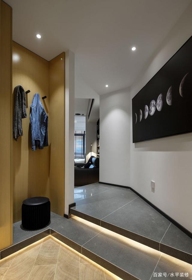 - 【户型图】 - 原始的房屋户型没有明显的空间划分,几乎所有的房间都是一体的缺少了很多的隔断,但这样居住的时候会感觉很没有隐私感,所以装修的第一步就是对房屋进行了重新的布局和调整,规划出不同的空间,满足日常的生活需求让小家变得更加舒适一些。  - 【玄关】 - 设计亮点:抬升部分空间 - 入户的玄关处没有明显的隔断和划分,所以装修的时候将玄关的部分空间抬高做出了一个小隔断, 并添加一些灯带作为照明,每天回家之后都会有温暖的灯光在迎接着自己,也会感觉很温馨。  - 玄关的侧面设计了实木的鞋柜和挂衣服的区域,简洁又实用可以满足日常的生活需求,同时也让进门的位置多了一些巧妙的设计感,小空间也可以让人耳目一新。   - 【客厅】 - 设计亮点:下沉式空间 - 客厅的位置是一个下沉式的设计,抬高的区域一面是玄关的入户空间,另外抬高的区域是卧室,中间下沉的位置则是一个休闲、阅读结合在一起的多功能区域,家里的面积不是很大所以不能设计很明显的墙壁隔断,这样用地台作为隔断的设计十分的方便,还保证了空间的通透性。    - 沙发后面设计了开放式的书架,深色的设计为客厅增添了一些沉稳的气息,同时也散发着生活的气息。   - 【厨房】 - 设计亮点:多功能水吧台 - 厨房的水吧台是一个多功能的设计,一方面可以方便平时做饭的时候使用,也可以方便平时的洗漱,简单的小镜子就足够业主日常洗漱的时候使用了。