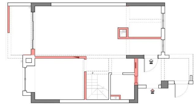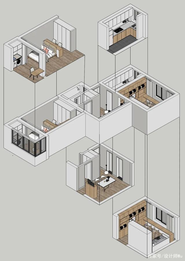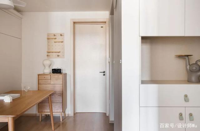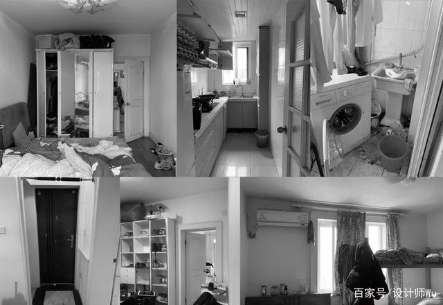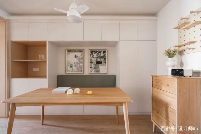 - ▲ 原始户型图(典型上海老式公房) - 存在缺陷: - 1. 由于是80年代的老式公房,入口并没有一个可以换鞋、收纳、置物的转换区,次净衣,背包都没有空间收纳,动线也非常不合理。 - 2.客厅是夹在两个房间中间的一个暗厅,采光差是硬伤。 - 3. 主卧的开间是3*4.5m,与常规卧室相比成为了一个长方形,如果按照常规布置,浪费空间又不美观。  ▲ 平面布局图 ▲ 平面布局图- 因为是老房,所以墙体调整更要谨慎,设计师请屋主帮忙申请了原始房屋结构图,最终确认原卫生间的墙体是可以改动的。 - 设计策略: - 1. 借用卫生间的面积,在入口设置玄关柜和穿衣镜。 - 2. 客厅大面积选用白色,点缀一些木质和绿色,提亮空间。 - 3.改变主卧的布局,将衣柜、超大书桌和床朝向阳台一字排开,还安排了投影仪方便屋主睡前观影放松。 - 4. 次卧放置沙发床,未来可改造成儿童房。 - 5. 卫浴不但做了干湿分离,还增加了次净衣柜。  ▲ SU模型图 ▲ SU模型图- >>>> 改造前  - 改造前房客瞒着屋主把房子改成了合租房,屋况可以用“惨不忍睹”来形容。 - 玄关  - 借用卫生间的面积,在入口处设置了玄关柜和穿衣镜,虽然只有小小的0.4㎡,但是它解决了一家人日常的收纳和中转的刚需,同时也让回家有了仪式感。 - 客厅  - 考虑到客餐厅是过道厅,采光较弱,没有选择过于沉重的颜色,大面积选用白色,再点缀一些木质和绿色,让这个暗沉的空间也有一点清新和松弛。  - 为了缓解厨房的局促,调整次卧的入口方位,在客餐厅设计了集西橱柜、卡座、家电收纳为一体的大型定制柜。   ▲ 多功能柜体 ▲ 多功能柜体- 2㎡收纳柜,释放更多厨房空间,平时家人用餐/客人来访/屋主的小伙伴来开会...可以满足不同场景下的使用需求。 - 另外各种家电也有了归置的地方,整体美观又实用,绝对是整个房子的“功能担当”!  - ▲客厅望向次卧  ▲ 另一侧通往主卧 ▲ 另一侧通往主卧- 全屋以原木色、白色为基调,低调朴素的同时提亮空间,不追求过度装饰,好的生活由每一天真实的点滴感受积累而成~ - 厨房  - 由于房型限制,厨房保持了原来的格局,设置L型橱柜。无论是家电设备,还是橱柜的五金件都做了升级,让这个5㎡的厨房发挥它的最大收纳力。  - 另外考虑到有老人住家,会有一个人在厨房洗碗的日常。在水槽的顶面上专门设置了一个小筒灯,照亮水槽的同时,也温暖着独自操劳的人儿。(屋主后期反馈,老人特别喜欢这个设计) - 主卧  - 原卧室格局是3*4.5米的窄长形,改变布局,将衣柜、书桌和床朝向阳台一字排开。  - 不仅轻松化解了狭长空间利用率不高的尴尬,更是满足了屋主要求的超大书桌+书柜,方便在家学习、办公。   - 2个1.5*2.3*0.3m的书柜,学霸屋主的海量书籍也能统统装下。  ▲ 床头背板后面是书桌 ▲ 床头背板后面是书桌- 书桌和收纳柜之间预留了充足的空间,柜门开合不会受阻。