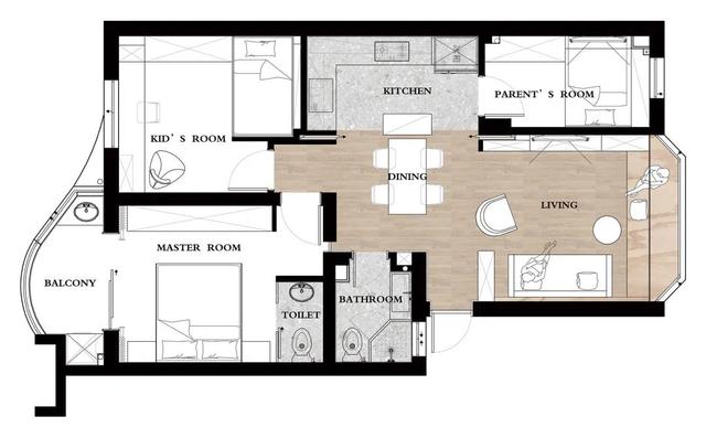 ▲装修实拍图 ▲装修实拍图- //原始户型// - 这套户型的格局方正,主卧和客厅都有阳台,保证了整体的采光和通透性。美中不足的是,原始户型是两居室,但是屋主一家三代人,至少需要三个房间,所以整体格局需要调整。  ▲原始户型图 ▲原始户型图- //设计亮点// - ①将厨房改为老人房,增加一间卧室; - ②借助儿童房和餐厅空间,做开放式厨房;
