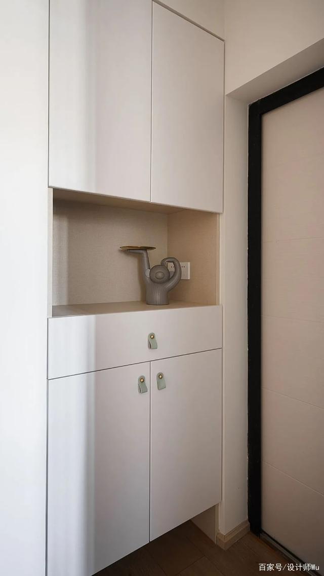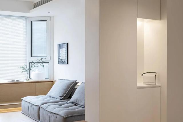 ▲装修平面图 ▲装修平面图- ||玄关:入户做玄关柜,兼顾私密性和收纳性 - 在原户型中,其实是没有玄关的,打开入门将一眼看尽屋内景象。为了提升全屋的私密性,设计师在入户门的右侧做了一组“顶天立地”的玄关柜,从视觉上隔开客厅区域,同时又提升了收纳空间。  ▲玄关实拍图 ▲玄关实拍图- ||客厅:电视书墙+地台飘窗,实用性更强 - 在传统客厅中,你一定会看到电视、沙发和茶几,它们带来的功能也比较单一。而在本期案例中,设计师解锁了客厅的新玩法,赋予了它休闲区和图书室两个新功能,好看又实用。  ▲客厅实拍图 ▲客厅实拍图- 设计师用整面书墙,代替电视背景墙,把“图书馆”搬进家中。书墙的设计也十分巧妙,白色的柜体搭配原木色滑动柜门,关上柜门的时候简洁清新;想要看电视的时候,可以把柜门打开,也不会影响整体观感。