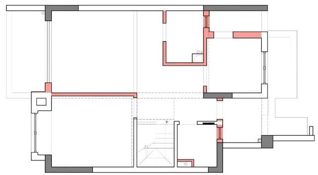 ▲ 原始户型图(二层) ▲ 原始户型图(二层)- 该建筑是复式挑空,原建筑130平的面积已经无法满足一家四人的居住使用。 - 存在缺陷: - 1.入户动线混乱。 - 2. 厨房面积比较狭小。 - 3.客厅南面拐角开窗,结构较乱。 - 4. 二层墙体较多,将空间分割成了一个个小房间。  ▲ 平面布局图(一层) ▲ 平面布局图(一层) - 我们将原有挑空的区域进行现浇,补充可使用面积。 - 设计策略: - 1. 改变玄关进门方向,优化动线。 - 2. 厨房拆除内部隔墙,并扩入原先走廊,增加使用面积。 - 3.拆除客厅、餐厅和阳台之间的隔断,重新整合开放式空间。 - 4. 主卧和次卧的墙体做“Z”字形改造,嵌入柜体。 - 5. 原本的零碎空间作为卫生间干区,合理利用。  ▲ SU模型图 ▲ SU模型图- 玄关