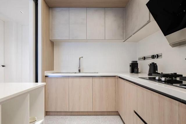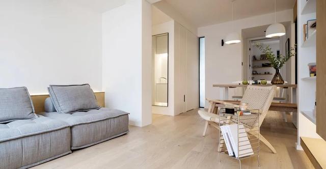 ▲客厅实拍图 ▲客厅实拍图- 地台的一侧,与书墙巧妙衔接,方便屋主随手拿取书籍。  ▲客厅实拍图 ▲客厅实拍图- 设计师取消了客厅的茶几,腾出留白空间,营造出更加通透的视觉感。  ▲客厅实拍图 ▲客厅实拍图- 客厅内浅灰色的豆腐沙发,搭配木质休闲椅,轻盈灵动,屋主可根据需求随意调整家居摆放。  ▲客厅实拍图 ▲客厅实拍图- ||餐厅:简单小巧,氛围感满分 - 由于原餐厅一半的空间给了厨房,所以现在的餐厅面积比较小,刚好放下四人位餐桌椅,可满足一家人的用餐需求。  ▲餐厅实拍图 ▲餐厅实拍图- 餐桌靠近厨房的吧台摆放,从视觉上起到了一定的延伸效果。  ▲餐厅实拍图 ▲餐厅实拍图- 厨房的吧台也充当了餐边柜的功能,内部可存放一些餐具,方便拿取。  ▲餐厅实拍图 ▲餐厅实拍图- ||厨房:隐藏式玻璃门,简洁不占空间 - 厨房和客厅之间,做了隐藏式玻璃门的设计,打开时门直接嵌入墙内,简洁不占空间;实用厨房上,可把推拉门关上,避免油烟飘入客餐厅。  ▲厨房实拍图 ▲厨房实拍图- 厨房的内部格局为L型,原木色的柜门搭配白色台面,整洁干净,易于打理。  ▲厨房实拍图 ▲厨房实拍图- ||主卧:温馨舒适,功能齐全 - 主卧选择了水泥灰色的艺术漆做背景墙,搭配柔和的灯带和床头灯,营造出温馨舒适的居家环境。