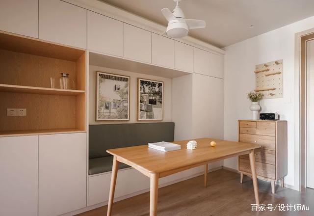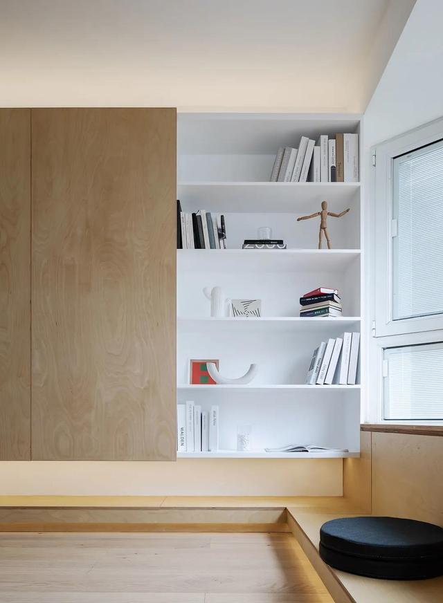 - 装法1:飘窗拆掉不可惜,多出地台+衣柜 - 以一换二,坐着喝茶顺便收纳,这种装法我是一眼相中!地台长2.35m,高度12cm,目前已经收拾干净,后期可以放个矮几在上面,两边各放个蒲团,这不就是个小小的茶室?不做茶室,这也是个小小的休闲区,躺在这里看书也蛮惬意。  - 收纳用时放恨少,除了衣帽间之外,地台侧边也留出1.1m长,一排2.4m衣柜装到顶,深度55cm,衣物存放在里面,也算是增加家里的收纳空间了,控制不住买买买的手,增加衣柜也不失为一种明智的做法。  - 装法2:mini书桌往这一塞,办公不要太合适 - 除了收纳与休闲功能,对于一些家里缺书房的,飘窗拆掉的区域,你改装书桌也是不错的选择啊。悬空书桌,2边储物格,对着窗户学习、办公,想想还是蛮舒心的。  - 下面这种落地书桌装法也成,自己怎么喜欢就怎么来。