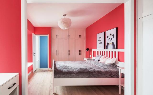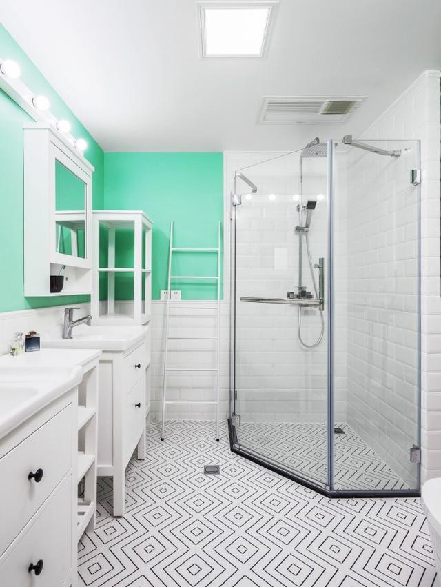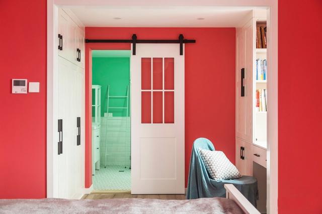 - 主卧里的卫生间门用的镂空式上推拉门,有些类似谷仓门,但又不完全是。  - 走进来一看主卫空间比较大,拥有两个分离式的洗漱区,钻石型的玻璃淋浴房能最大限度利用空间做好彻底的干湿分离,即使外面的门是中看不中用的推拉门,也是能基本保证水汽不会蔓延。  - 卫生间内的清新绿与外面的魔力红形成强烈的反差。但那么亮眼的红色搭配白色的家具,反倒是削弱了它的浮夸感,床头选用的黑白配色的挂画,还有毛绒质感的吊灯,都在削弱红色给空间带来的冲击感,尽量柔和平静。