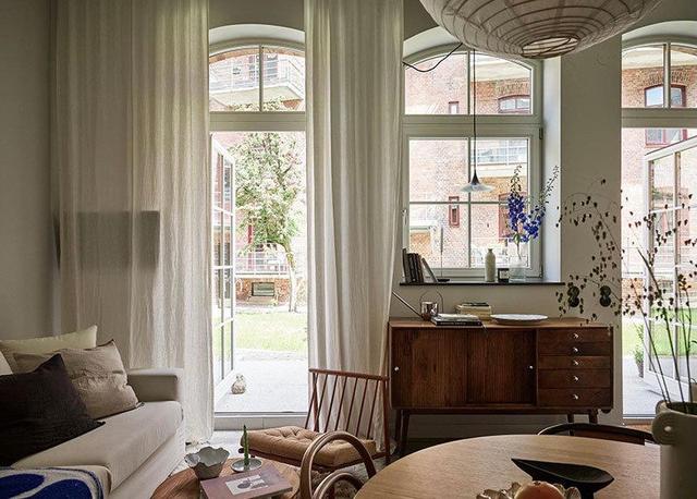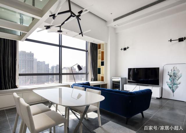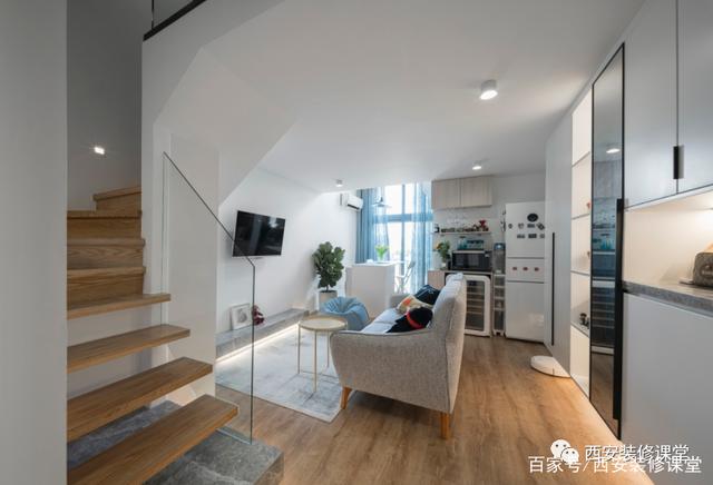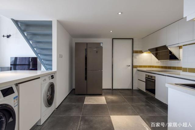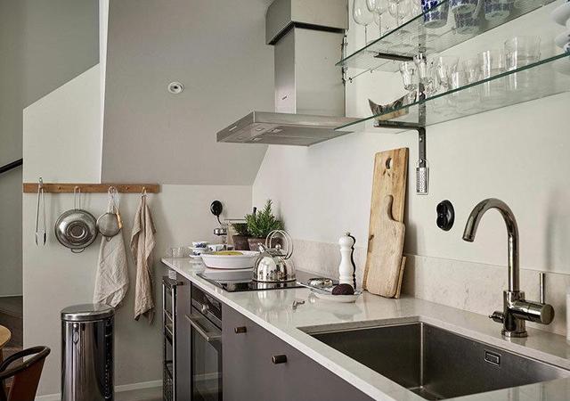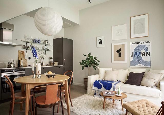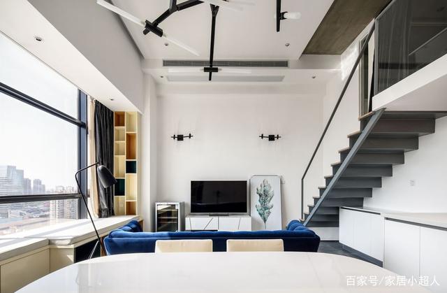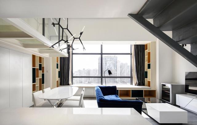 - ▲ 空间充斥着现代意味。白色调背景墙围绕的空间里,野口勇的吊灯,米白调沙发地垫,黑色橱柜,美得很高级。  - ▲小圆桌,门口的立柜,原木色调感受到自然优雅,还有一点点的复古韵味,令人感到有生活气,惬意舒适的居家氛围。  - ▲门口的小玄关,做成开放式的衣帽鞋架,收纳功能强大,简单最实用。  - ▲ 良好的采光会带来好心情。独特的房屋结构,有高大弧形窗户带来通透的采光。一席米白窗帘,保证清幽的居住环境。  - ▲ 厨房、餐厅、客厅融合一体,各自用代表的家具来表达用途。黑、白、木三色搭配很出色,保留了空间的通透感与层次感。  - ▲充分考虑每一个角落的空间的美感。靠墙的楼梯扶手,金属垃圾桶,都变成了装饰,简练干净。  - ▲中性色调与金属玻璃等不同材质纹理结合,使烹饪区看起来很宁静。台面材料也选择了耐用,易清洁的人造石台面。  - ▲这个阁楼房屋,空间完美的与现代化装饰结合在一起,整个开放式的生活区充满阳光,告别我们对传统loft的印象。 - 02二层:黑白利落的线条感