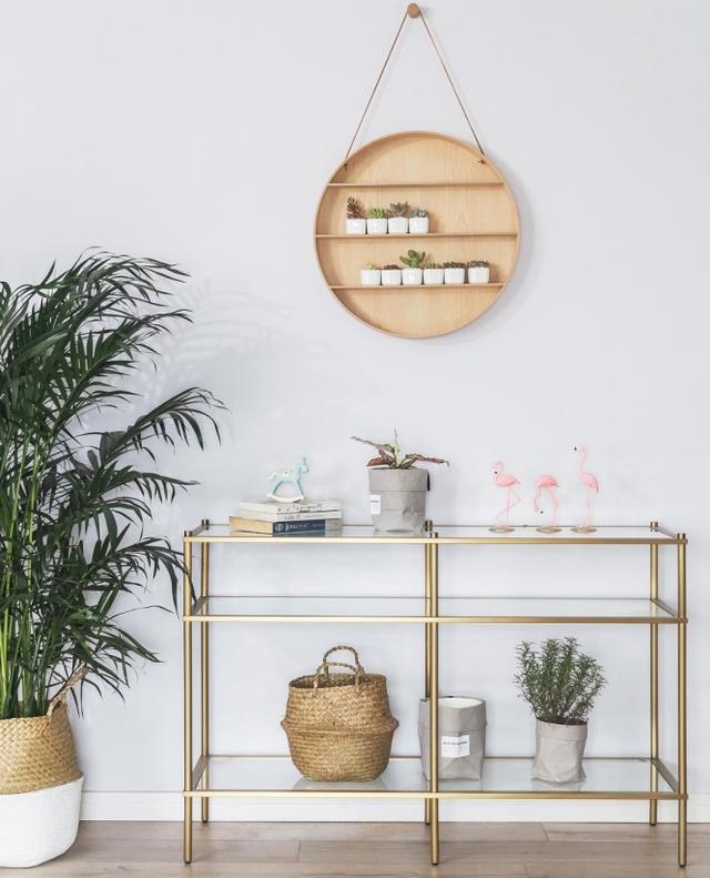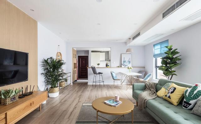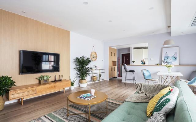 - 套内面积在115㎡的大横厅,长条形一进到底的户型布局,容易进门就一览无余,稍微不爱整洁就容易显得杂乱。  - 从这头可以望到玄关位置,原本的大横厅优势没有显现出来,沙发还是按照传统的布局摆放。 - 客厅采用大面积的原木色和白色乳胶漆墙面作为搭配, 只有薄荷绿的沙发有些跳脱,在沉闷的木色中添加一丝清新感。  - 电视墙的设计简单又不失一些些的小心机,采用木饰面板分隔开看电视区和用餐区,简单的细脚跟茶几打造休闲娱乐的会客中心。  - 在客餐区域的中间这面墙,采用了金属色的置物架当做摆台,简约清新的绿植打造家中最干净的区域,金属色和旁边的木色相呼应,并不会感到突兀,如果换成黑色的置物架,反而会不搭。  - 楼梯区域大面积的运用宝蓝色乳胶漆涂刷墙面,提升了整个空间的活泼度,有些俏皮。 - 楼梯的底部没有浪费空间,打造平开门收纳,用作小飘窗的封闭式书柜。  - 沙发后边的小飘窗作为家中小小的休憩之地,可以当作第二个沙发,在上面睡觉比睡在床上格外的香喷喷。  - 餐桌的位置直接紧贴开放式厨房的吧台,吧台特意做高了20cm,为的是遮挡住厨房台面的杂乱。这样的开放式吧台设计,非常符合屋主的习惯和爱好,做菜之余还可以闲聊。  - 玄关和厨房没有墙体相隔,厨房旁就是餐厅。在水槽这一块原本是一面整墙的非承重墙,特意打掉后做成了开放式厨房,这样会显得空间更加通透自由。