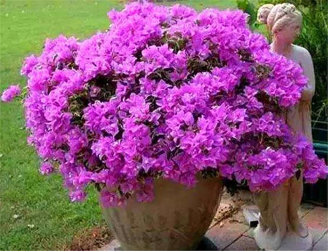 - 2,浇水 - 三角梅的生长旺季是在夏季,植株的生长和开花会需要大量的水分,所以此时浇水的频率要频繁一些,我们可以等到盆土表面干至5厘米左右时进行浇水,基本上每天浇1~2次水,浇水后要保持良好的通风,盆栽的三角梅要及时地排除积水,避免盆内积水,导致三角梅的根系腐烂。  - 夏季浇水的时间最好选择在清晨或者傍晚,中午最热时分千万不可以浇水。如果你家的三角梅属于晚花的品种,那么夏季由于还没到花期,可以适当的控水,这样可以有效的刺激三角梅萌发花苞。但是此种方法的使用要慎之又慎,一旦发现三角梅的叶子开始发黄、干枯就要增加浇水量。 - 春季属于三角梅花期前期,为了刺激三角梅孕育花苞,浇水频率可控制在两天一次,也可以在植株周围喷水雾增加水分。秋季属于花期末尾,应减少浇水量,直到土壤表面开始发白发干时,再一次性的浇水要浇透。冬季气温低要严控浇水频率,越冷的地方,浇水的次数越来越少,甚至不需要浇水。  - 3,施肥 - 三角梅那旺盛的生长速度其实是需要更多的养分来供应,而开花的数量也需要养分的支撑,所以要给三角梅定期的施肥。而季节不同,温度不同,施肥也有所差异。施肥时要保证土壤的疏松透气,这样有利于植株吸收养分。  - 在