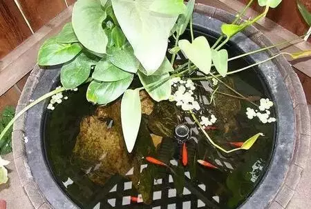 古木水池四周常青,滴水观音和燕窝蕨类植物,凤眼莲,金鱼和藻类漂浮在水中。宛如深山瀑布,波涛荡漾。