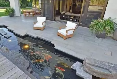 门前的水池设计感很强,但在散落的石头装饰下显得随意自然。下午时分,坐在水池里,看鱼嬉戏,会有什么样的享受