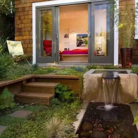 小空间,大水池,金鱼在水里嬉戏,岸边郁郁葱葱,陶罐上的水是精彩的点睛之笔。