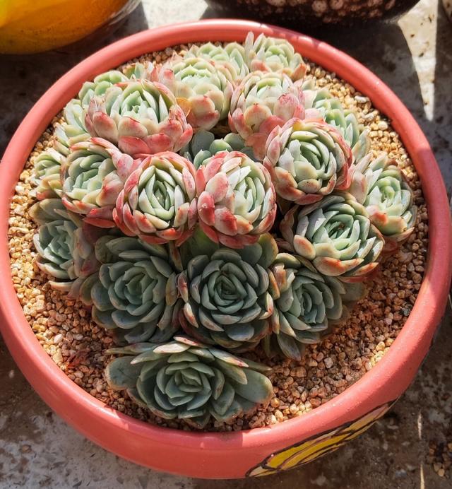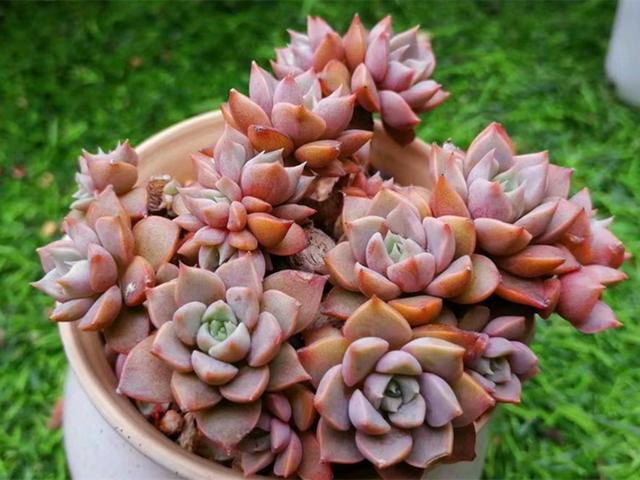 很多说法认为夏梦就是玫瑰夫人,但是也可能是杂交品种,春天买的夏梦,没有玫瑰夫人叶片那么大,但是特别爱爆头,夏天颜色也非常美,可能是因为夏天还能呈现美丽的粉紫色,所以名字才叫夏梦吧。夏梦喜欢颗粒稍多的土壤,配土最好用百分之七十以上的颗粒,小盆控养夏梦可能叶片会长得比较小,但是容易出状态也不影响爆头,夏梦是三十度也可以晒太阳的多肉,夏天淋雨也很少出现问题。