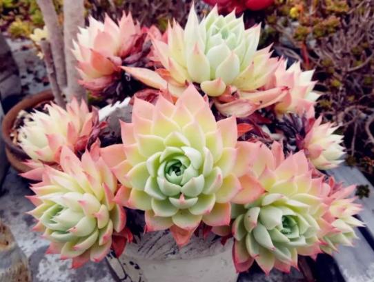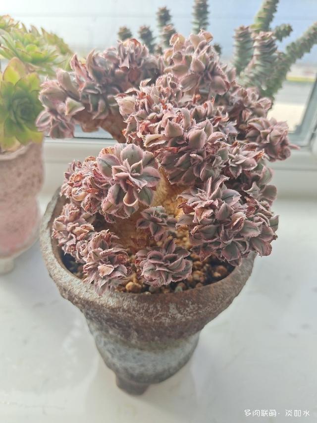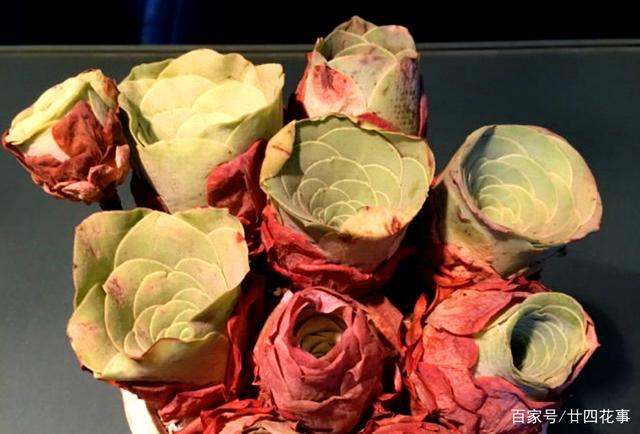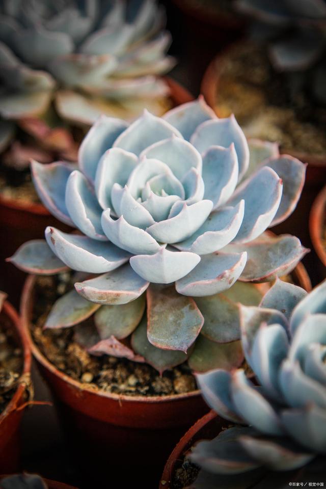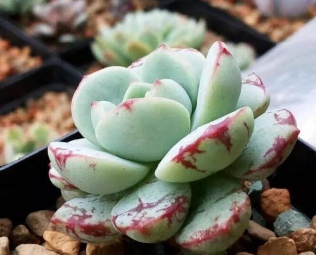 叶片肥厚,植株上覆盖一层白霜,平时灰绿色,光照充足,温差大的秋冬季,叶片渐变成深粉红色,叶片饱满美艳似花。