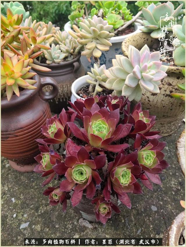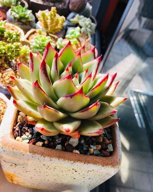 形态特征:叶片为细长匙状,前端肥厚,斜尖,莲花状紧密排列,整体同心圆,夏季叶心翠绿,秋冬向外周幅射呈鲜红色。叶色醒目,使人非常赏心悦目,受人喜爱欢。