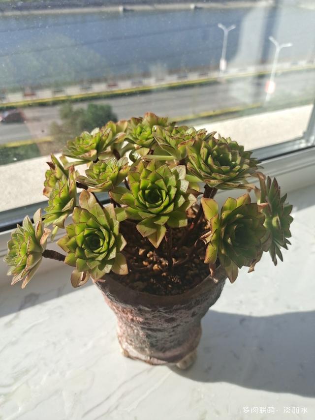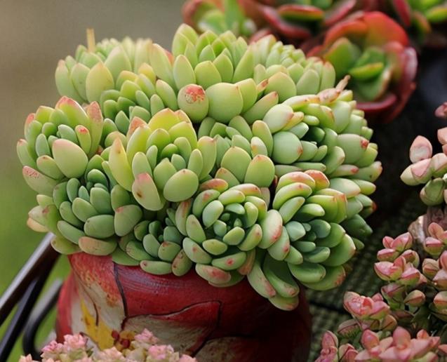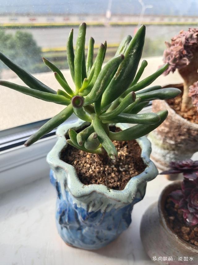 和佛珠有一点相似,不过叶子的形状没有那么圆鼓鼓,它也是非常好养活的一种多肉植物,平时就喜欢晒太阳,夏季的时候,放在散光通风的地方养就好了,少浇点水,保持盆土疏松透气排水就好了。