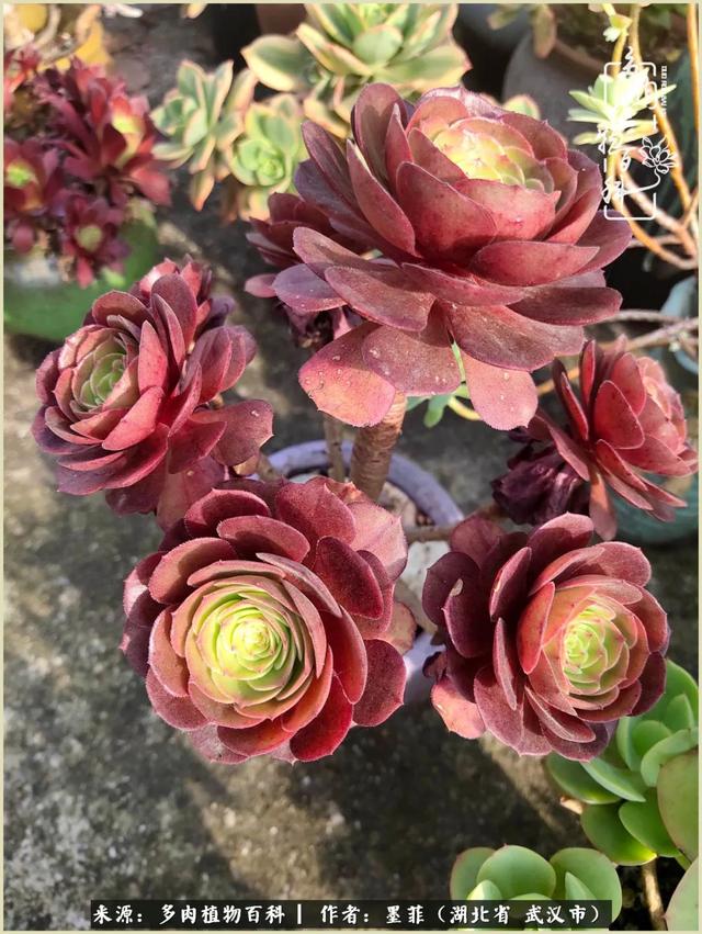 大概是因为桃蛋实在太美,以至于掩盖了其它风车草属多肉植物的光芒,以前阿伦培在风车草属多肉里的知名度并不高,甚至品种来源也未知,一度被认为是姬胧月或胧月的杂交品种,其外形特征也确实与两者有许多相似之处。这两年因为外形酷似紫乐,加上各种悬崖桩的推波助澜而迅速走红。