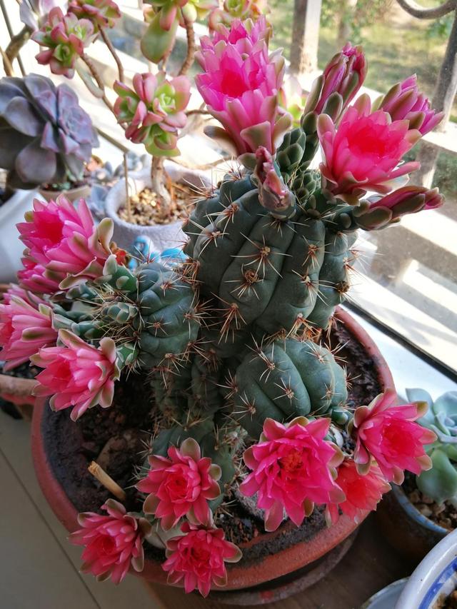 虽然是仙人球里面非常普通的一种,但是真的很容易养,而且它和别的仙人球不一样还可以复花,花色有很多种真的很漂亮。有的朋友养的绯花玉,夏季都不用给它遮阴防晒的,冬天只要温度不低于零度,也不用拿进室内,一年四季露养,照样长势很好,一点压力都没有,年年都开花,一直都在开花,生长状态很不错。