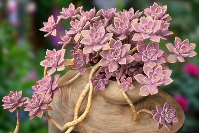 阿伦培又名艾伦培,一直被誉为集景天和风车草属所有优点于一身的品种,叶片肉质肥厚,表面覆一层均匀的白粉,叶片排列成紧凑的花朵状。在日照充足的环境下叶色粉紫,仅仅只有叶心微微泛绿,它的生长速度比较快,并且容易长枝干,养成老桩后主茎和分枝可变为垂盆生长,形成群生的肉质灌木状,因此常用来控养老桩和悬崖桩,控形较好的多年生悬崖桩如同多肉瀑布,让人叹为观止。