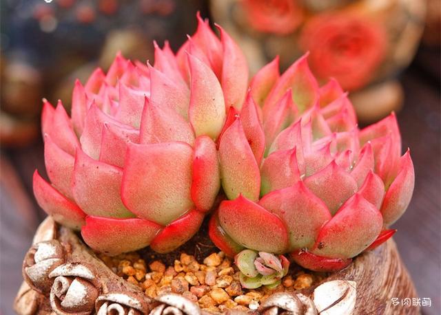第二种适合六月扦插的多肉就是乙女心,它属于景天科景天属多肉植物,爆崽能力非常强,叶片一般都是细长的椭圆状,表层还覆盖一层白粉,在上色彻底的时候,可以从灰绿色变成桃粉色,犹如娇羞的少女一般,密密麻麻的叶片堆积在一起,看起来就非常有生机和活力。