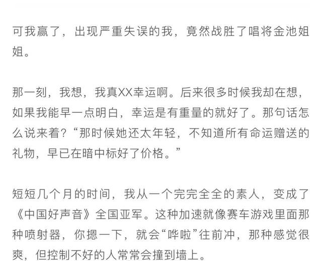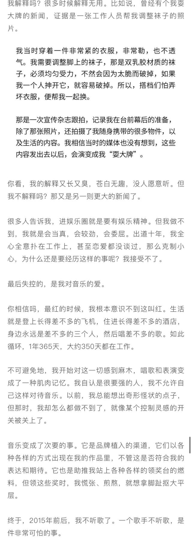 - 吴莫愁在采访中坦言,自己是属于那种比较容易失控的人,也 一直处理不好与媒体的关系,先是音乐失控,再是各种各样的负面新闻,随之而来失控的是作为音乐人的她对音乐的爱。“终于,2015年前后,我不听歌了,一个歌手不听歌,是件非常可怕的事情。”  - 当一个歌手不再听歌又无法顺利录唱,吴莫愁给自己按了暂停键,最红的时候退圈回家照顾妈妈,与外界隔绝!她自认不是所有人都有这样允许自己停下的权利,明星艺人已经比普通人额外获得了许多,也明白娱乐圈残酷,暂停后能不能回来都是未知数。这样通透的吴莫愁真是挺令人佩服的。  - 采访中,谈到自己的软肋是家人,以前被记者追问父亲,会让吴莫愁没法表情管理;三年前,妈妈生病她果断停下一切工作回家。微博首页刷到一句:她已经失去了爸爸,不能再失去妈妈了,更不能失去她自己。 瞬间泪奔!  - 内娱真正保持特立独行的女歌手,真的不多!吴莫愁绝对算一个,欢迎回归!真心祝愿姐姐能更好! 如今的她强势归来,总是在逐梦路上不断奔跑,经历各种磕磕碰碰,这样吴莫愁才是粉丝们的所爱,必须支持!  - 现在的很多人总是患得患失,畏手畏脚,在不经意间就会失去很多东西,看了吴莫愁的那篇自述,真的是越来越喜欢这个勇敢乐观的女孩子了!  - 现如今她回归《中国好声音》的舞台做导师助教,“从前那条路我已经走过了,这次回来,或许可以走不一样的路。”沉寂三年重新出发,也许我们可以期待那个自信独特的吴莫愁再归来!