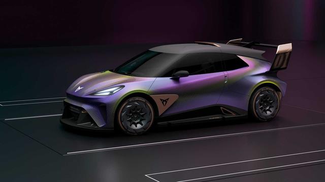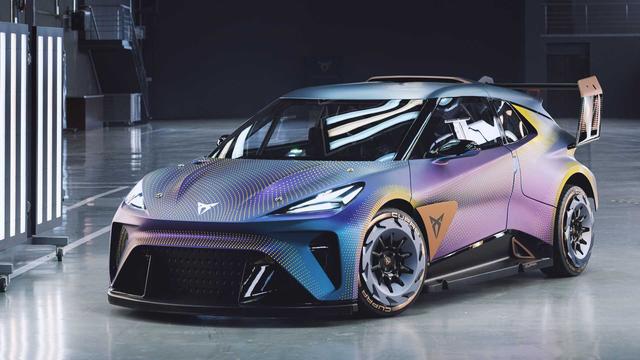 - 作为一款概念车,Cupra UrbanRebel造型格外抢眼,全车不仅采用了炫彩车身涂装,还有排布整齐且密集的小圆点,所以密集恐惧症患者可能要敬而远之了。除了密集的小圆点外,这款概念车造型是非常大胆的,前脸巨大的中网很有燃油车的意思,但电动车不用考虑水箱和中冷器散热问题,所以帅就完了。  - 来到侧面,应该是借鉴了拉力赛轮毂散热罩的设计,车辆轮毂给常战斗。而在前轮后侧一块三角板应该是为了空气动力学而设计的,但这样的设计在开门时未免有些怪异,不过这台车是在2025年才会推出的城市电动车,Cupra首席执行官韦恩·格里菲思 (Wayne Griffiths) 也表示:“这种赛车概念为未来街车的设计语言提供了思路,并将激发其创作灵感。”所以,最终量产车型还不知道是什么样子呢。