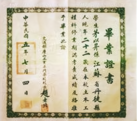 图 茅以升 图 茅以升- 科学是不分国家的,但科学家却是有祖国的 - 1949年9月,茅以升从上海前往北京参加第一届中国人民政治协商会议,在会议上,茅以升第一次与毛泽东见面,但两人对于彼此还是很了解的,毛泽东一把便握住了茅以升的手:“你是造桥的,很好嘛!这是为人民在做好事啊。” - 茅以升对于这位中国共产党最伟大的领袖的夸奖,很是荣幸,他的手紧紧地握着,还一边认真地点着头。  图 毛主席与茅以升见面 图 毛主席与茅以升见面- 尽管茅以升第一次见毛主席,但事实上在茅以升心里,却对毛主席神往已久。1940年2月20日,毛主席在文化协会第一次代表大会上的演讲稿被发表在《解放》期刊中,题目为《新民主主义论》。而茅以升却是在1946年在上海时才拜读到此文。 - 文章中毛主席完整清晰地分析了近代中国社会的性质,和中国为什么要经历革命,要改革的是什么,如何进行有效地改革以及改革最终的目标等。还向社会各界介绍了中国共产党关于新民主主义革命与新民主主义社会的理论,为中国未来的发展标明了方向。 - 茅以升读后大为惊叹,在他接近半个世纪的生活中,见证了旧中国的黑暗,也一直在这黑暗中努力寻找着光明力量,然而毛主席的文章,就像是一阵曙光,让茅以升看到了希望。 - 茅以升出生于1896年1月9日,是江苏省镇江人。小时候,在他家乡每年端午节都会在举办赛龙舟的活动,很是热闹。十岁那年的端午节,茅以升原本计划与小伙伴们去观看比赛,但突发胃痛的他,只好在家里休息。突然外边传来了消息,文德桥坍塌了,许多人因为事故而丧生。 - 侥幸逃过一劫的茅以升,伤心极了。原本还一起嬉戏玩闹的小伙伴们,如今却天人永隔,回忆着与小伙伴们快乐的时光,小小的茅以升暗下决心,自己一定要修一座最坚固的桥,不让悲剧再次发生。  图 茅以升的毕业证书 图 茅以升的毕业证书- 从此刻苦努力的茅以升,怀揣着梦想考进了唐山交通大学(现西南交通大学),毕业后,茅以升便参加了清华大学的留美考试,并以优异的成绩获得乐公费留学的机会,就读于美国康奈尔大学的桥梁专业。 - 1917年茅以升顺利毕业,获得了康奈尔大学桥梁专业硕士,随即又进入了美国卡耐基梅隆大学攻读博士学位,他在此期间发表的博士论文《框架结构的次应力》一文,被业内誉为“茅氏定律”,并获得了康奈尔大学颁发的优秀研究生“斐蒂士”金质研究生奖。  图 青年茅以升 图 青年茅以升- 远赴海外的茅以升,比别人付出了更多的努力,他知道自己的梦想与目标,他知道自己今天能站在这异国他乡的土地上,是自己多少年的勤学苦读换来的,没有任何一个理由允许他浪费时间,他一心只为学到更多的知识,再苦再累只要望向遥远的东方,自己的祖国,便能得到慰藉。 - 毕业后的他得到了许多条件丰厚的工作机会,但他不忘初心,毅然选择了回归祖国,为祖国的科技建设奉献自己。他曾说过:“科学是不分国家的,但科学家却是有祖国的。” - 回到祖国后,茅以升发现中国的大江大河之上,都是外国人建造的桥,于是便暗暗立志,一定要为祖国建设属于自己的大型桥梁。由于当时国内各方面没有足够的实力去建造一座大型的桥梁,茅以升只能等。  图 茅以升与曾养甫 图 茅以升与曾养甫- 他先选择回到唐山交通大学当一名教授,秉承着科学救国的思想,致力于为祖国培养建筑人才。终于在1933年茅以升被老同学拜托,接下了建设钱塘江大桥的重任。 - 他不负众望,在当时落后的工程建筑水平下,排除万难,于1937年9月26日,在浩荡湍急的钱塘江上,中国第一座自主设计与建造的现代化钢结构桥顺利通车了。  图 建桥前开工典礼合影 图 建桥前开工典礼合影- 这座桥对于中国的建筑业有着划时代的意义,不仅如此,而更重要的是当时日本侵华,无数的百姓因为有此及时撤出从而得救,无数的物资及时的送到了前线,战士们因此无虞。 - 但仅仅通车89天,为了阻挡日军的侵略,为建桥呕心沥血的茅以升便亲自指挥了炸桥的行动,他说:“要炸,就把桥墩一同炸断!”  图 被炸毁的钱塘江大桥 图 被炸毁的钱塘江大桥- 当时在部队下令,只是命令炸掉五孔的钢梁,但茅以升深知这座大桥的意义,如果它对我们的作用是很大的,那么对于日本侵略者的作用也是一样的,所以要炸就要炸的彻底,不能留给侵略者将它修复的可能。 - 茅以升眼睁睁地看着自己注入了万千心血而建成的大桥就这样炸毁,渐渐地沉向水底,痛惜极了,而这件事也成为了茅以升很多年的心病,他再也开心不起来了。 - 这一等就是十年,终于在抗战胜利后,茅以升得到了上级领导的命令,命他重建钱塘江大桥。十年里郁郁寡欢的他立马兴奋了起来,在茅以升的带领下,耗时七年终于在1953年再次顺利通车。 - 怎样对人民有利,我就怎样做 - 建国后的茅以升,担任了北方交通大学的校长,并且还是铁道研究院的院长。上级领导对他的重用,让他十分高兴,他觉得自己终于可以放开手脚,完完全全地施展自己的才华,完成自己科技救国科技兴国的理想。