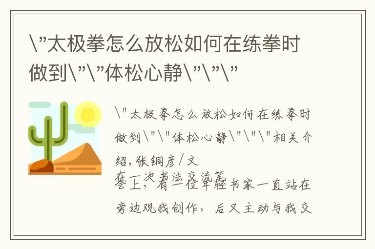 "太极拳怎么放松如何在练拳时做到""体松心静"""相关介绍,张铜彦/文 在一次书法交流笔会上,有一位年轻书家一直站在旁边观我创作,后又主动与我交谈,说我写字的...