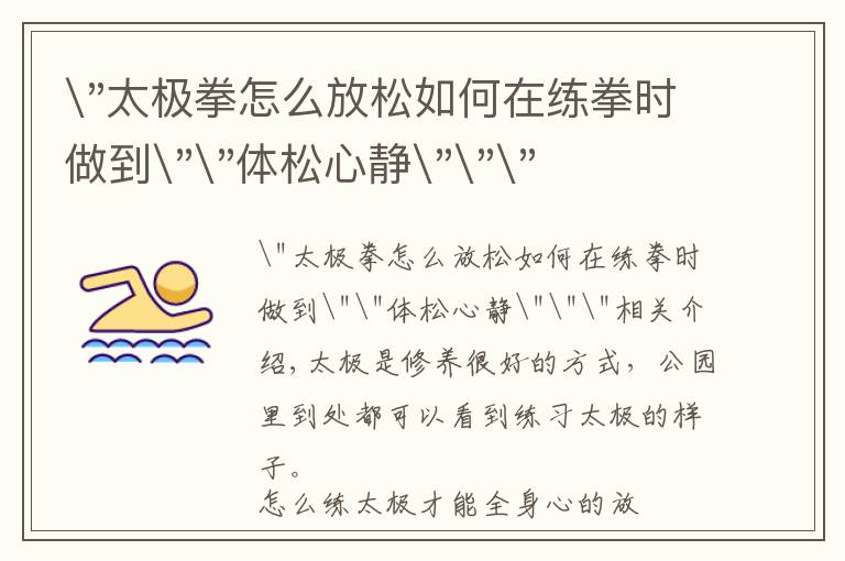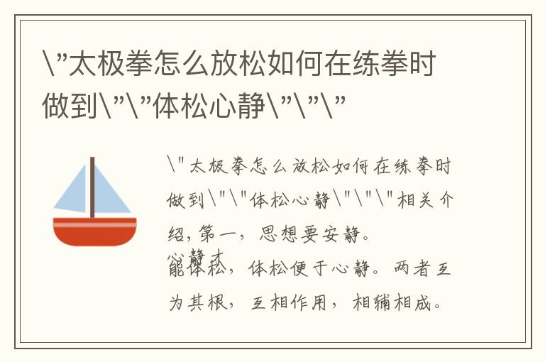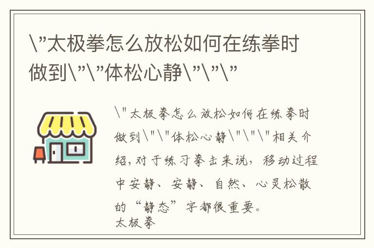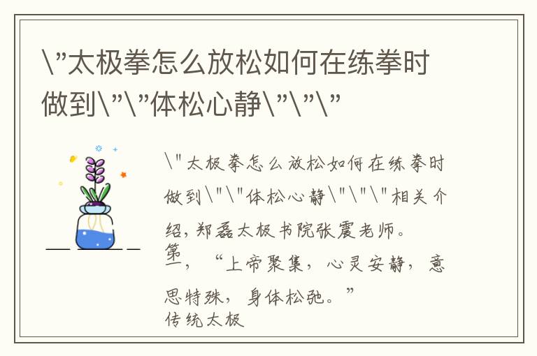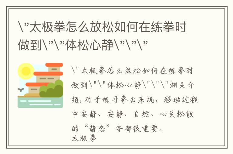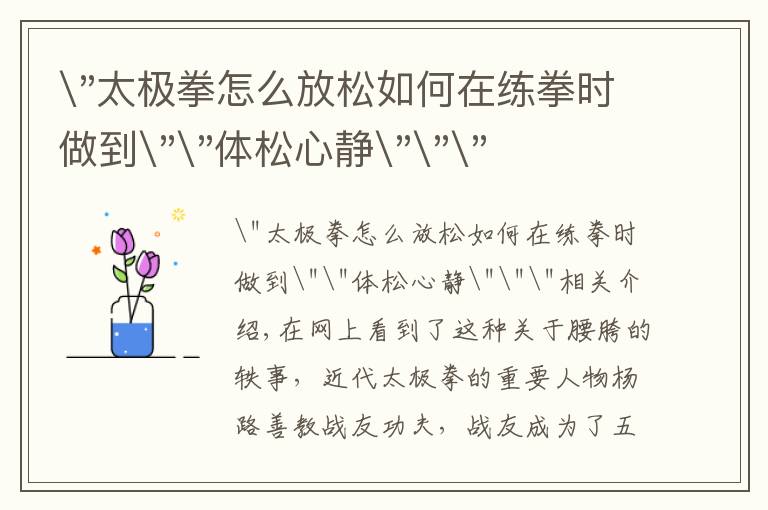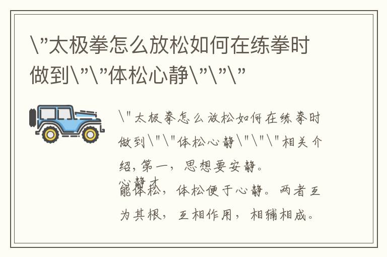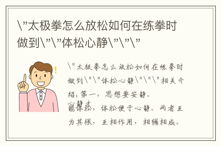 "太极拳怎么放松如何在练拳时做到""体松心静"""相关介绍,第一,思想要安静。 心静才能体松,体松便于心静。两者互为其根,互相作用,相辅相成。如果练拳时边练边说...