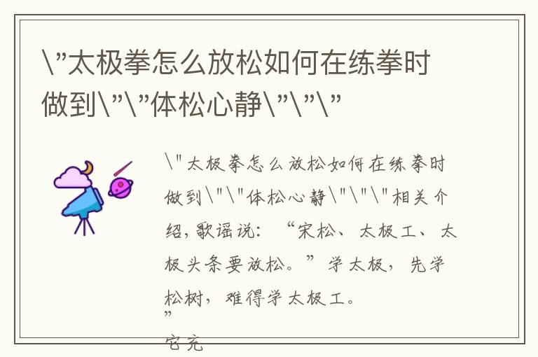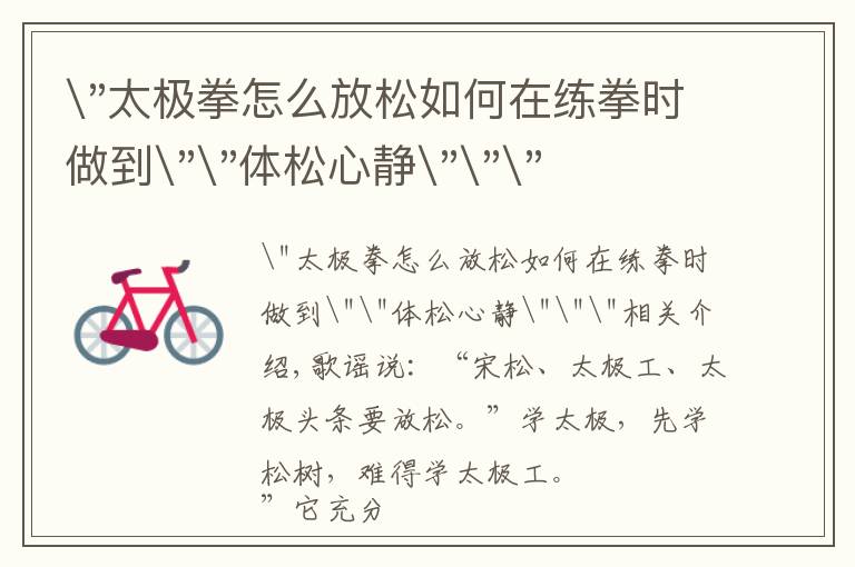 "太极拳怎么放松如何在练拳时做到""体松心静"""相关介绍,歌谣说:“宋松、太极工、太极头条要放松。”学太极,先学松树,难得学太极工。 ”它充分说明,放松是演练...