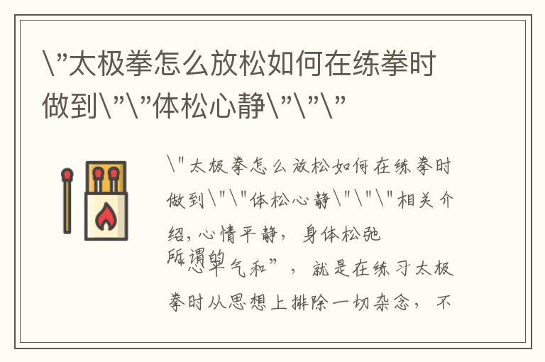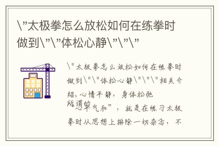 "太极拳怎么放松如何在练拳时做到""体松心静"""相关介绍,心情平静,身体松弛 所谓的“心平气和”,就是在练习太极拳时从思想上排除一切杂念,不受外界干扰。所谓...