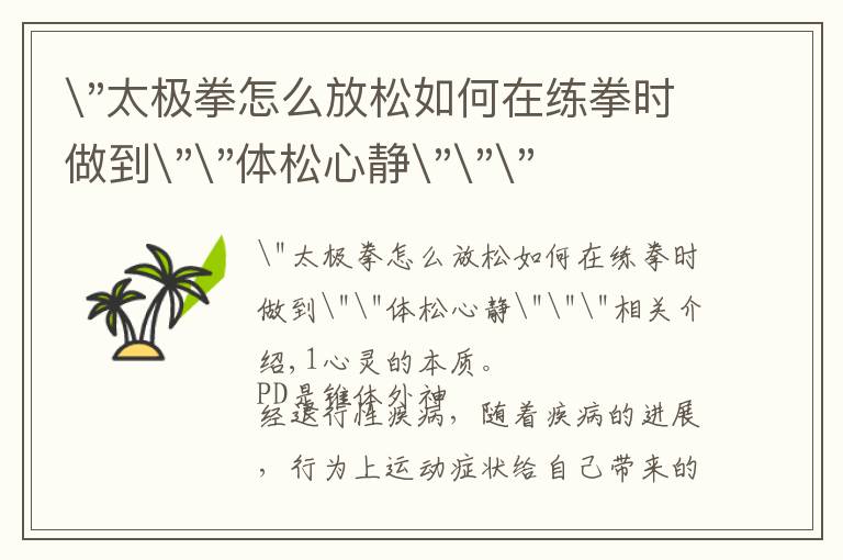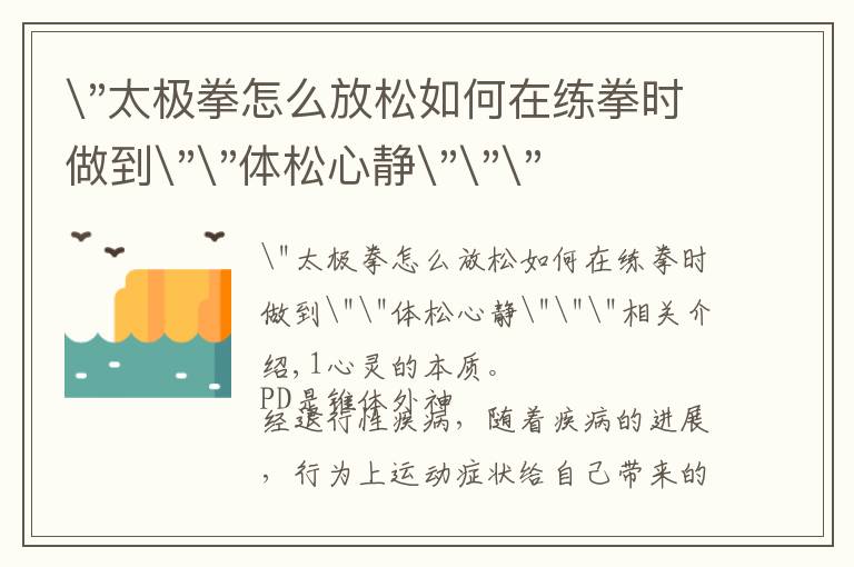 "太极拳怎么放松如何在练拳时做到""体松心静"""相关介绍,1心灵的本质。 PD是锥体外神经退行性疾病,随着疾病的进展,行为上运动症状给自己带来的生活质量下降...
