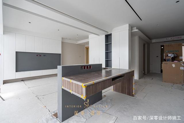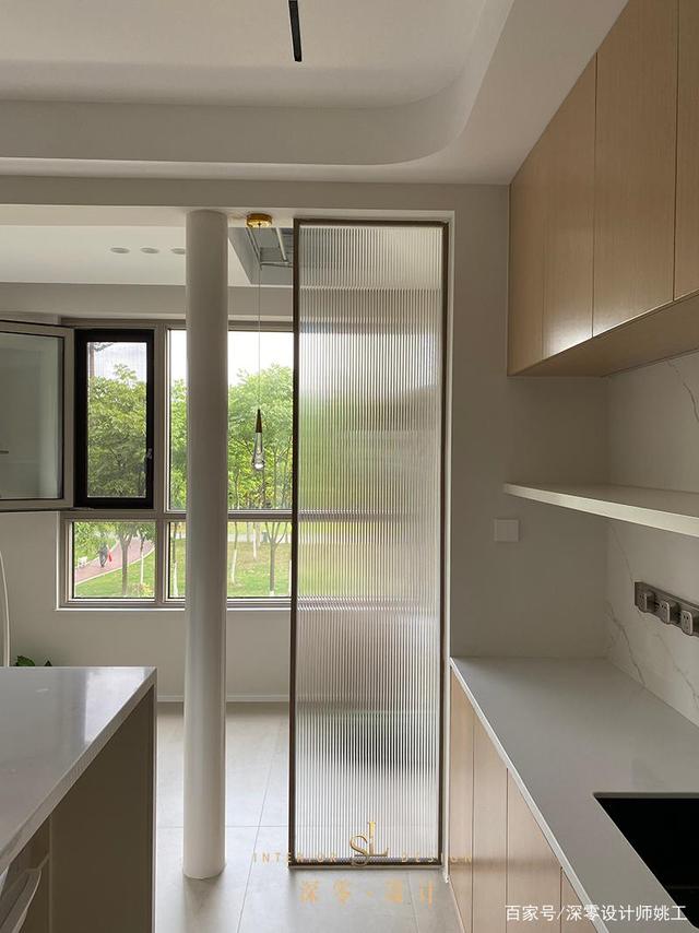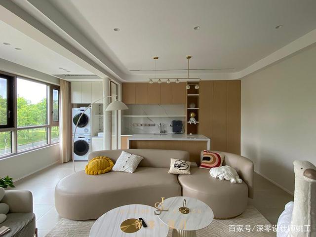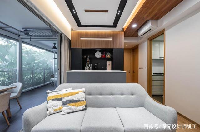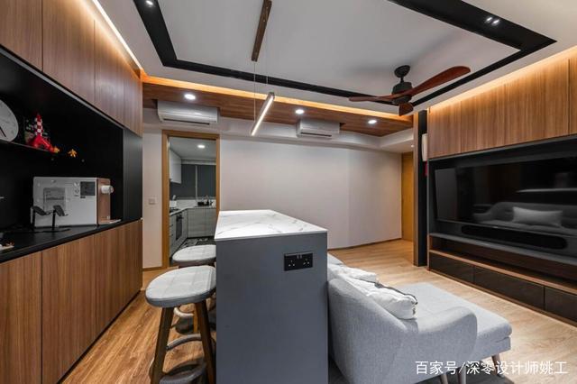 但凡客厅不是太小,基本都能做到这一点,沙发后面不靠墙,单独隔出一个小西厨,用吧台做隔断,最好再留个水槽,省得每次洗水果啥的都得去厨房。