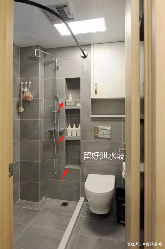 ▲记住,设置壁龛,一定要在底部留个泄水坡,这是很多装修者忽略的,这个泄水坡度不用太陡,放洗浴用品不会滑下来就可以,最里面比最外面要高一些,这样当洗澡时就不会出现上面屋主那样,而且后期想要清洁,拿着花洒头对着冲洗,干干净净,这样是不是更加方便更加舒适了!