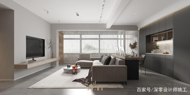 ●除了沙发靠着吧台,咱们用书桌做隔断,后面腾出整个开放式书房;