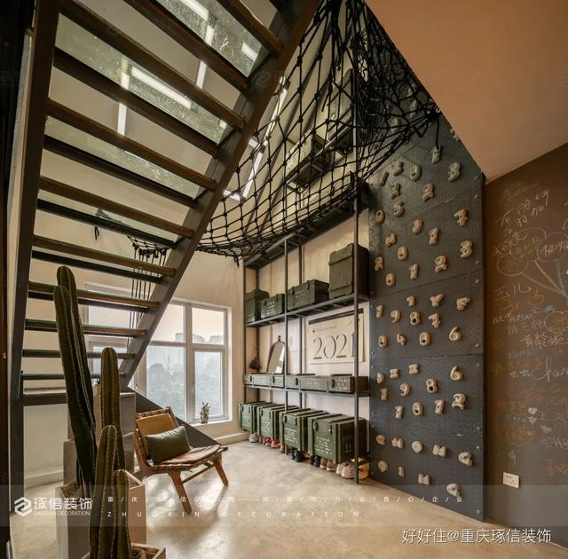 家里每个空间都是有意思的地方,右手边加装攀岩墙,不用出门都可以体验攀岩带来的快乐。