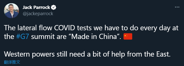 - 从图中内容来看,照片拍摄者拿着一份状似文件袋的东西,贴在外包装的纸上印有G7峰会和英国国民医疗服务体系(NHS)的标志,标题写着“Additional information for Testing at G7 Summit for the DHSC COVID-19 Lateral Flow Self-Test (Rapid Antigen Test)”(有关在G7峰会进行DHSC(卫生及社会关怀部)新冠侧流式自我检测(快速抗原检测)的更多信息),下面则是一些注意事项和相关部门的联系方式。 - 值得注意的是,虽然包装上多处印有英国国民医疗服务体系的标志,但位于其最下方的那行“MADE IN CHINA”还是暴露了其最初的生产地:中国。 - 从这名记者的描述来看,参加G7峰会的所有成员,或至少是他的记者同行们,每天都要接受这项“中国制造”的检测,不过相较于其他G7峰会相关“重磅新闻”,这个与记者们息息相关的细节却似乎遭到了西方各大“主流媒体”与“公共舆论”的忽略——截至发稿时,这则推文只获得了34次转发、26次引用和179次点赞。 - 所谓“侧流式检测”(Lateral Flow Test)是检测病毒抗体的一种方式。在这条推文评论区有人提到,自己见过的所有侧流式检测(试剂)都是来自中国,而“我们给了他们数百万元”。  - 有人表示:“制造业总是在中国完成的”。  - 《经济学人》布鲁塞尔分社社长邓肯·罗宾逊评论:“不确定通往西方财富的道路是不是由制造尖尖的塑料棒(指采样拭子)铺就的。”  - 也有人讽刺道:“虽然(这次G7峰会的)主题就是破坏‘一带一路’和针对中国,但中国依然希望这次会议能在有安全保障的前提下进行”。 ![[观察者网]欧洲新闻台记者:G7峰会每天用的检测试剂是“中国制造”](https://www.lu-xu.com/pic.php?url=https://pics4.baidu.com/feed/2fdda3cc7cd98d10ac2334d63afb1d0679ec90aa.png?token=6737f8292c0b68a2baf19d59d96cd85f)