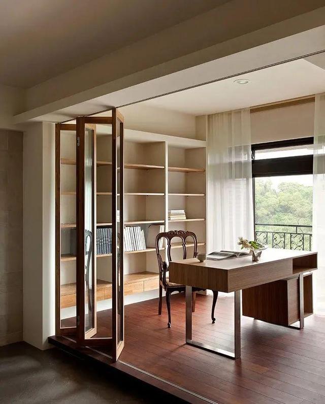 书房里有外墙窗户,保证采光和通风,同时将玻璃折叠门完全打开,那么实现南北通透,能够更好的改善室内的采光和通风,不比阳台空间发挥的引光、通风效果差呢。