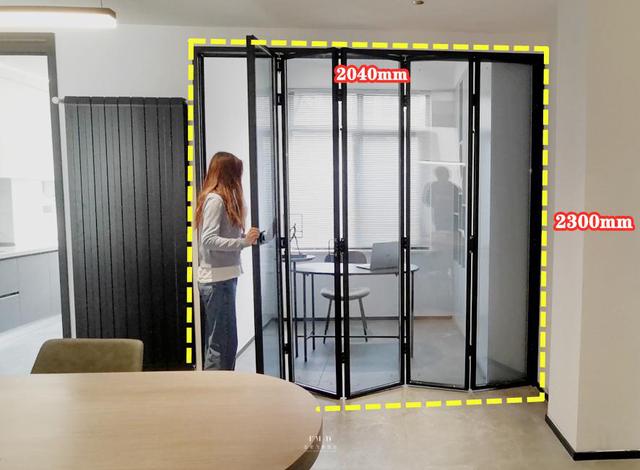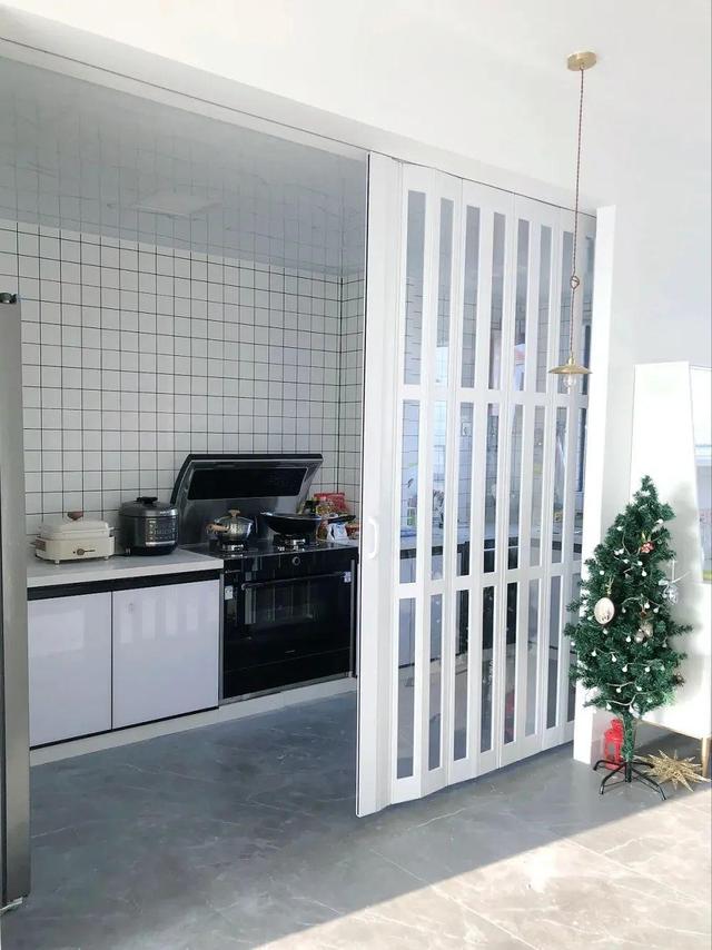 小片的门扇折叠起来占地面积更小,不用时推到厨房里面,在客厅内完全看不到有门的痕迹,空间上更具有开阔感。