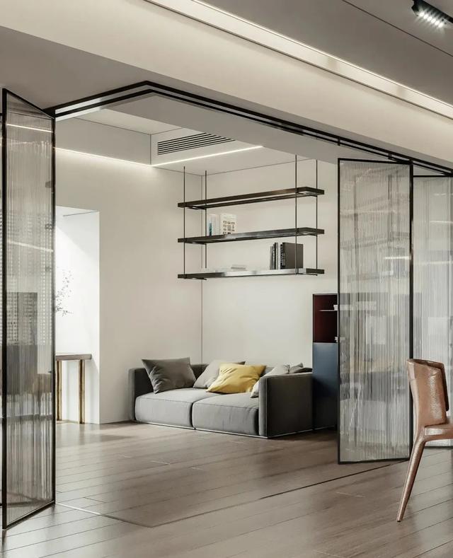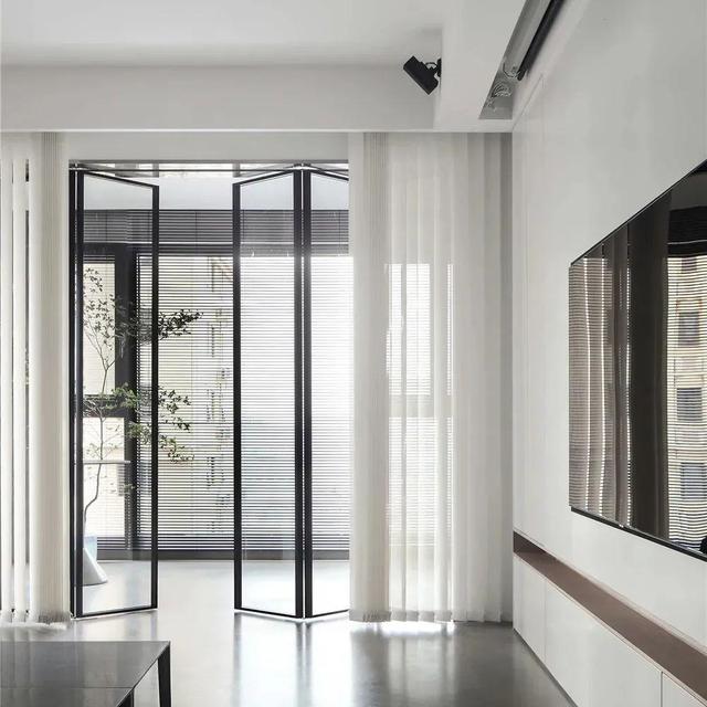 窄边金属框加大面积长虹玻璃,双开折叠门带给客厅一种朦胧美,极简设计表达了现代人所向往的简意生活。