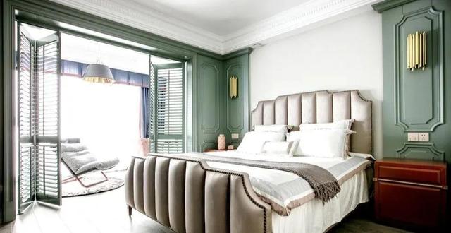 小阳台与卧室相连,抹茶绿折叠门做成百叶窗的形状,造型复古优雅,轻轻一拉扇叶便呈闭合状,将光线阻挡于室外,空间静了下来。