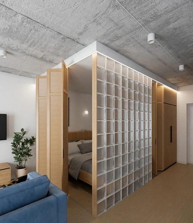 玻璃砖+折叠门的设计消解了水泥墙体所带来的压抑感,而且长条形折叠门推拉时占用空间更小,即便在狭窄区域也能使用。