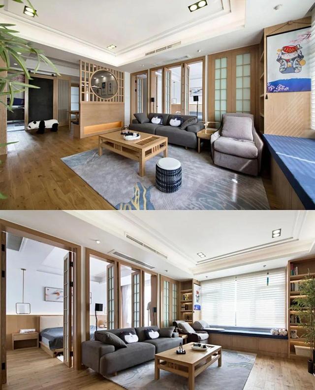 将折叠门放置于沙发后面,顶天立地式造型,颇有明清古典门窗的意味,全部打开后,卧室与客厅的边界感不再明显,自由因子在跳跃。