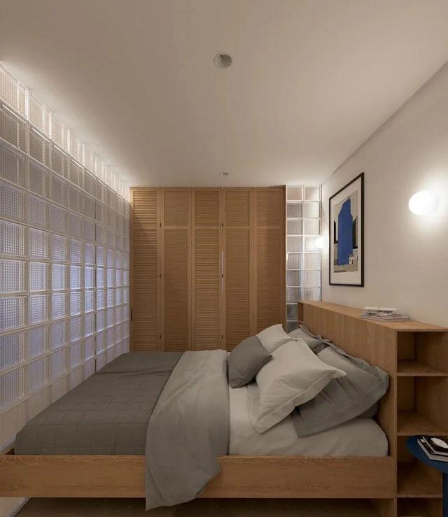 睡觉时将折叠门全部展开,玻璃砖和木质门严丝合缝,形成的密闭空间更能保护屋主隐私,为睡眠增加一份安全感。