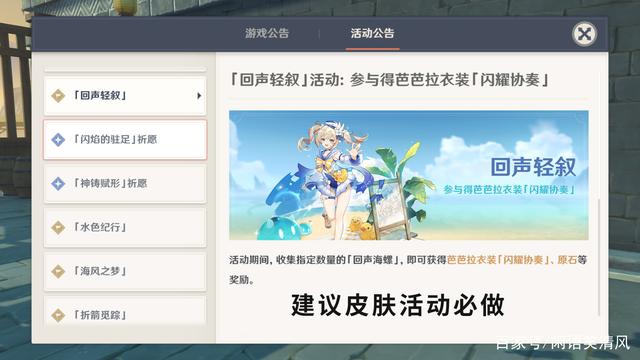 在版本前瞻中有很多活动会加入1.6版本,其实细数下来也不算很多。在版本更新后,先行登场的活动有海岛大冒险和回声轻诉,现阶段游戏公告中便有。其中海岛大冒险除去正常奖励之外,还有一个可莉的专属武器嘟嘟可故事集,提升重击伤害和攻击力,挺契合可莉的。而回声轻诉的活动就有讲究了,收集海螺可以获得芭芭拉皮肤,而到了1.6版本结束之后,倘若没有芭芭拉皮肤就只能去商城购买了,1680创世结晶,还是有点贵的,所以建议到时候皮肤必拿。
