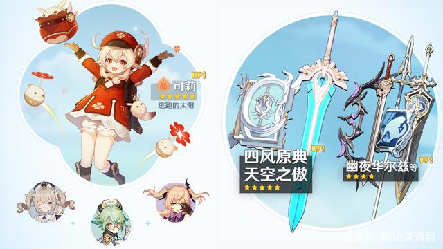 可莉卡池的角色并没有让人意外,之前的爆料消息还是蛮准确的,除去可莉之外就是菲谢尔、芭芭拉和砂糖。就可莉而言,从角色的强度来看,和其他角色相比略显平庸,加上操作比较复杂,重击有50%的几率不消耗体力且伤害增加50%,并且重击的暴击会为队伍所有角色回2点能量,总之,可莉需要很高的操作。不过从外貌角度来看,可莉绝对是萌爆的,所以看个人情况抽取。至于4星角色,我个人感觉比较一般,可以作为中期过渡但很难陪伴一直畅玩于提瓦特大陆。