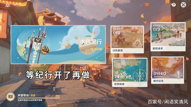 另外呢,1.6版本到来之前,纪行任务也已经关闭,到了下个版本是水色纪行。而纪行的每周任务都是固定的,周本挑战、每周的3次居民请求以及3次讨伐悬赏想必大家也都知道,而新版本是在周三,所以我的建议是先按捺一下冲动,不要急着打,等版本更新了再来。虽然说纪行对于很多玩家都会溢出,但是早一点获得奖励,就能早一步提升。