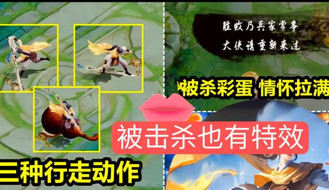 就比如他被击杀的时候,仍然会有一个彩蛋出现,也就是右上角大家可以看到的这一句话,只要李逍遥阵亡这一句话就会出现,而且他在游戏当中还有三种行走动作,这是其他传说级皮肤不具备的,或者其他典藏级皮肤都不具备。