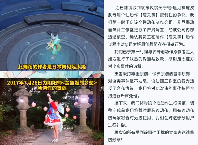 我们来简单回顾一下这件事,说白了就是遇见神鹿皮肤的鹿灵舞,跟RB的阴阳师舞现“金鱼姬”所原创的舞蹈撞车了。与其说是撞车,不如说是舞蹈动作两者基本都是一模一样的。然而再来看日期,“金鱼姬”的舞蹈是四年前自创的,而瑶妹遇见神鹿皮肤的动作,是在去年的四月份上架的。所以这样看来的话,基本也就实锤了。而王者荣耀官方也是承认自己抄袭,发出公告宣布瑶妹绝版动作屏蔽下架,后续会给拥有鹿灵舞动作的玩家补偿。那么补偿会是什么呢?