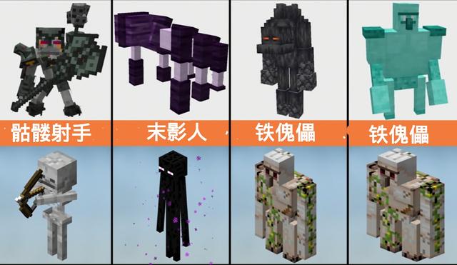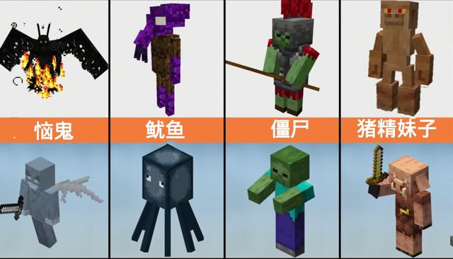 僵尸;在电影当中,僵尸是比较可怕的生物。然而在mc中,僵尸确实最可爱的。老玩家给僵尸增加并不好看的铁套装,但是你仍然会觉得很呆萌。