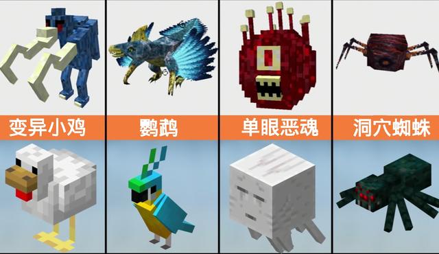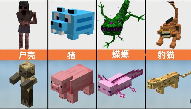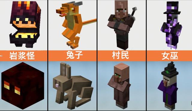 岩浆怪;如果你看到过箱子在模组的成精模样,你会觉得岩浆怪的变化很熟悉。岩浆怪增加了大大的嘴巴,一口可以吞一个史蒂夫。