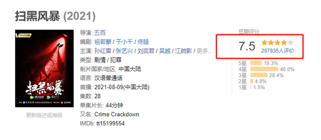 大结局该讲的没讲、加了一堆没有多大用处的感情线,还被广告占去了大量时长,这个花钱得来的大结局未免也太让观众憋屈了。而观众的憋屈也直观地反应在口碑上,《扫黑风暴》的豆瓣评分,从开分时的8.0分直接降到了7.5分,被隔壁《理想之城》稳稳地压了一头。
